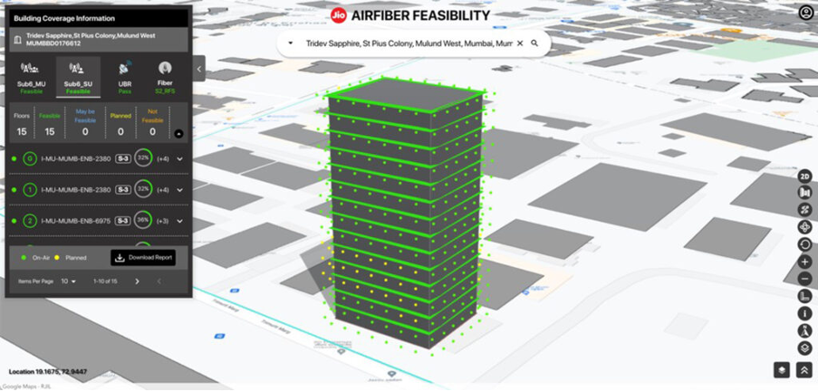 This building-level intelligence became the cornerstone of Jio’s wireless planning. Each structure was further subdivided into 3-meter point meshes to model signal availability at every floor level. This meant every 10-foot by 10-foot section of a building could be evaluated for signal strength and availability, allowing the network team to assess exactly where AirFiber service could be delivered—even before towers were activated.