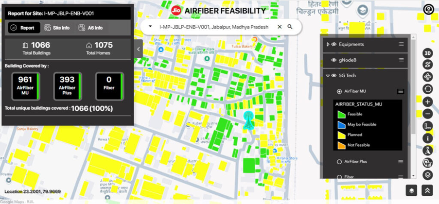 As India raced into the digital future, Reliance Jio introduced a groundbreaking service: Jio AirFiber. Designed to deliver gigabit-speed broadband over the air using 5G and unlicensed band radio (UBR) frequencies, AirFiber doesn’t require traditional fiber lines to the home. Instead, it uses rooftop or in-building equipment to receive wireless signals directly from nearby towers. The result is an internet service that is fast to deploy, easier to install, and perfectly suited for dense urban areas or hard-to-reach regions where traditional fiber buildouts would be costly or slow. But deploying a service like this at a national scale—within months—demanded reimagining how telecom networks are planned, activated, and optimized. That’s where GIS stepped in.